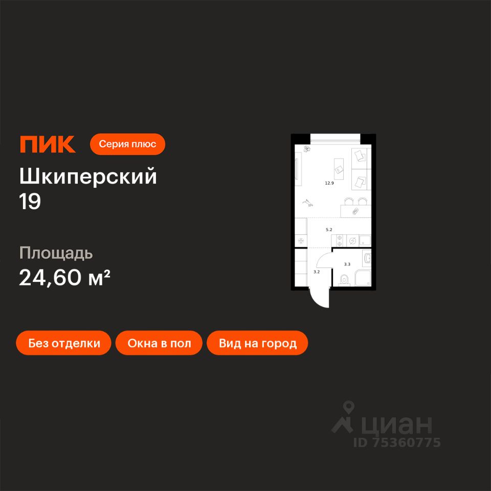 Продаётся квартира-студия площадью 24,6 кв.м на 3 этаже 8 этажного дома (Корпус 2, Секция 6) проекта ПИК Шкиперский 19. Светлый просторный подъезд на уровне земли, функциональная планировка, большие окна, без отделки.