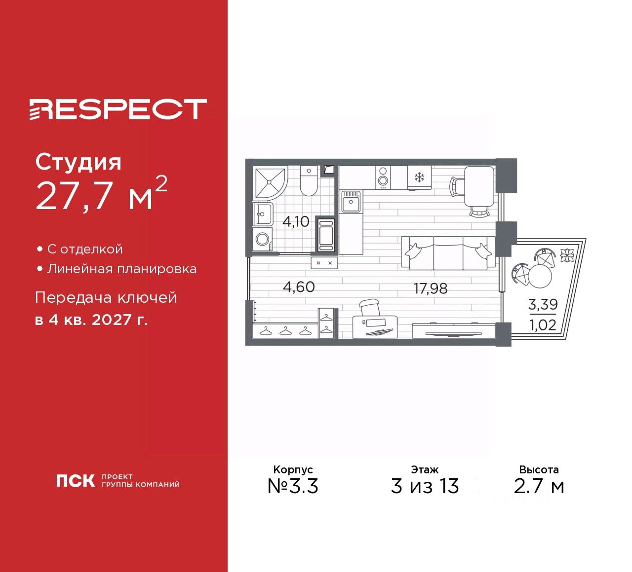 Однокомнатная квартира-студия с отделкой в ЖК ''RESPECT'' на 3 этаже. Общая площадь: 27.7 кв.м., площадь гостиной 17.98 кв.м., из которых 5 кв.м. выделено под кухонную зону. Все окна выходят на одну сторону. В квартире один балкон, один совмещенный санузел. Высота потолков 2.7 м.
