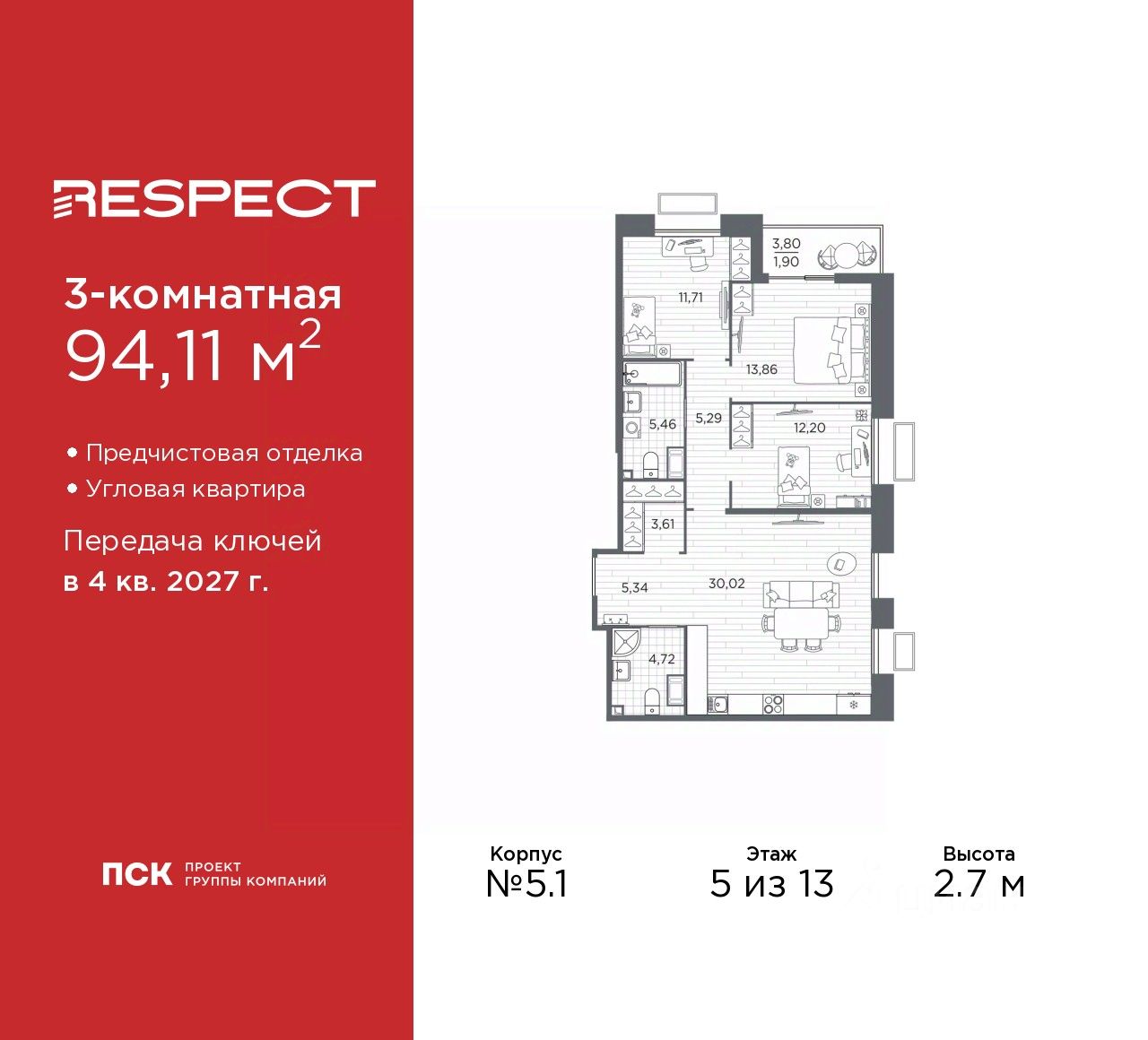 Просторная трехкомнатная квартира с предчистовой отделкой в ЖК ''RESPECT'' на 5 этаже. Общая площадь: 94.11 кв.м., жилая: 37.77 кв.м., площадь просторной кухни-столовой: 30.02 кв.м. Квартира угловая, очень светлая, естественная вентиляция при открытии окон. В квартире одна лоджия, два совмещенных санузла. Высота потолков 2.7 м.