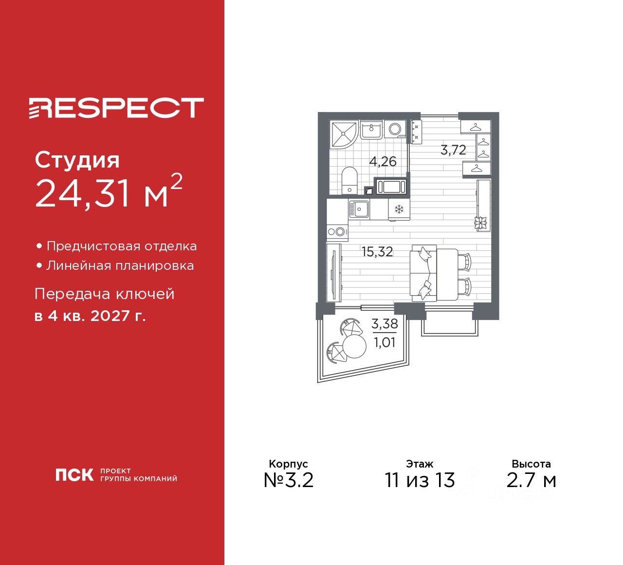 1-комн. квартира-студия с предчистовой отделкой в ЖК ''RESPECT'' на 11 этаже. Общая площадь: 24.31 кв.м., площадь гостиной 15.3 кв.м., из которых 5 кв.м. выделено под кухонную зону. Все окна выходят на одну сторону. В квартире один балкон, один совмещенный санузел. Высота потолков 2.7 м.