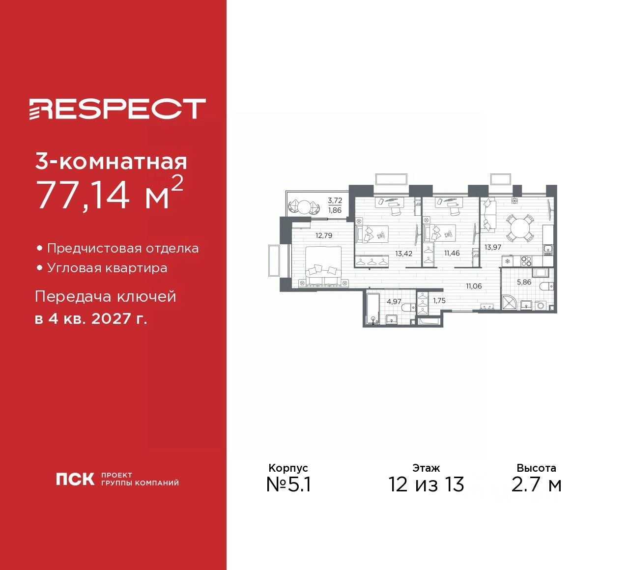 3-комн. квартира с предчистовой отделкой в ЖК ''RESPECT'' на 12 этаже. Общая площадь: 77.14 кв.м., жилая: 37.67 кв.м., площадь просторной кухни-столовой: 13.97 кв.м. Угловая квартира, идеально подойдет любителям тишины и панорамных видов. В квартире одна лоджия, два совмещенных санузла. Высота потолков 2.7 м.