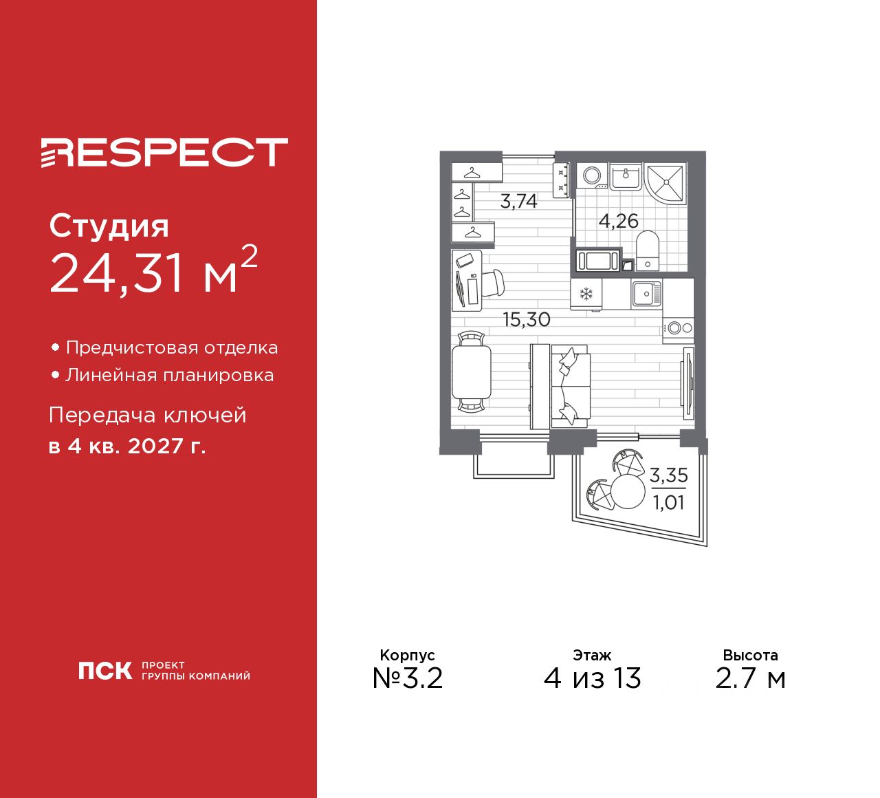Продается 1-комн. квартира-студия с предчистовой отделкой в ЖК ''RESPECT'' на 4 этаже. Общая площадь: 24.31 кв.м., площадь гостиной 15.3 кв.м., из которых 5 кв.м. выделено под кухонную зону. Все окна выходят на одну сторону. В квартире один балкон, один совмещенный санузел. Высота потолков 2.7 м.