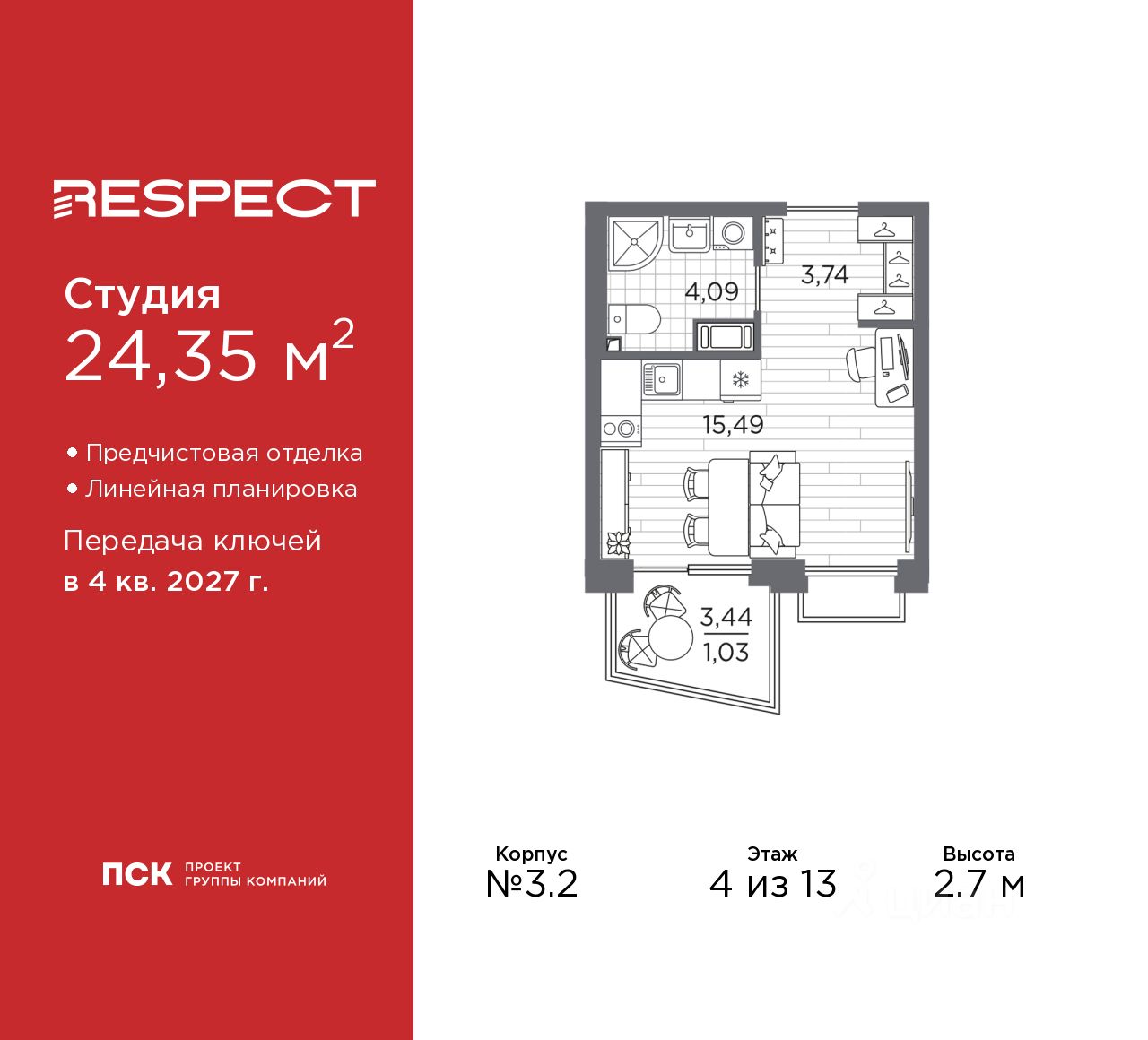 Просторная однокомнатная квартира-студия с предчистовой отделкой в ЖК ''RESPECT'' на 4 этаже. Общая площадь: 24.35 кв.м., площадь гостиной 15.49 кв.м., из которых 5 кв.м. выделено под кухонную зону. Все окна выходят на одну сторону. В квартире один балкон, один совмещенный санузел. Высота потолков 2.7 м.