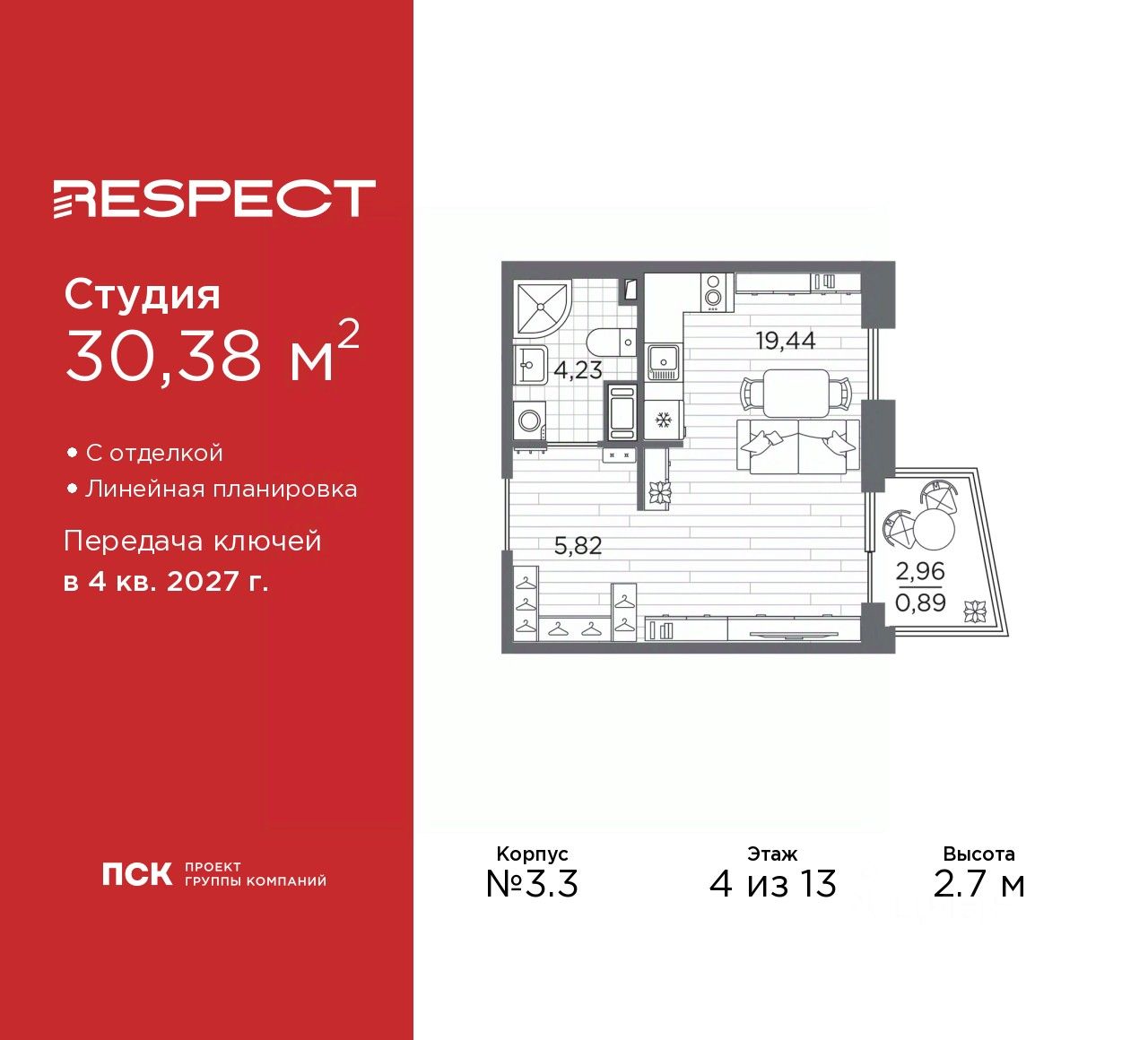 1-комн. квартира-студия от застройщика с отделкой в ЖК ''RESPECT'' на 4 этаже. Общая площадь: 30.38 кв.м., площадь гостиной 19.44 кв.м., из которых 5 кв.м. выделено под кухонную зону. Все окна выходят на одну сторону. В квартире один балкон, один совмещенный санузел. Высота потолков 2.7 м.
