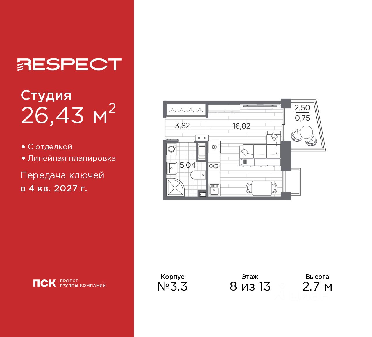1-комн. квартира-студия от застройщика с отделкой в ЖК ''RESPECT'' на 8 этаже. Общая площадь: 26.43 кв.м., площадь гостиной 16.82 кв.м., из которых 5 кв.м. выделено под кухонную зону. Все окна выходят на одну сторону. В квартире один балкон, один совмещенный санузел. Высота потолков 2.7 м.