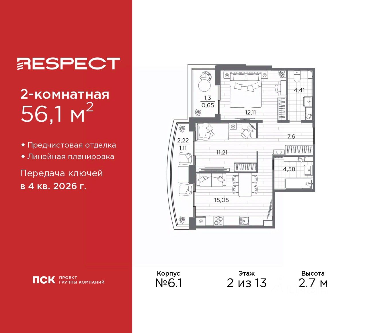 Двухкомнатная квартира с предчистовой отделкой в ЖК ''RESPECT'' на 2 этаже. Общая площадь: 56.1 кв.м., жилая: 23.32 кв.м., площадь просторной кухни-столовой: 15.05 кв.м. Комнаты изолированные, все окна выходят на одну сторону. В квартире один балкон и одна лоджия, два совмещенных санузла. Наличие в квартире террасы дает возможность для создания зон отдыха в кругу семьи и друзей. Высота потолков 2.7 м.