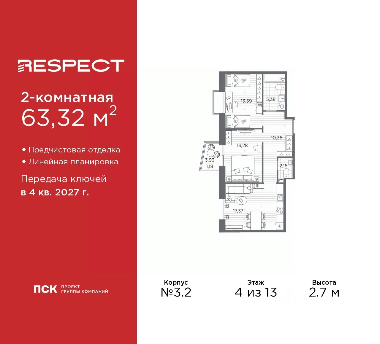 Просторная 2-комн. квартира с предчистовой отделкой в ЖК ''RESPECT'' на 4 этаже. Общая площадь: 63.32 кв.м., жилая: 26.87 кв.м., площадь просторной кухни-столовой: 17.37 кв.м. Комнаты изолированные, все окна выходят на одну сторону. В квартире один балкон, один совмещенный и один раздельный санузел. Высота потолков 2.7 м.