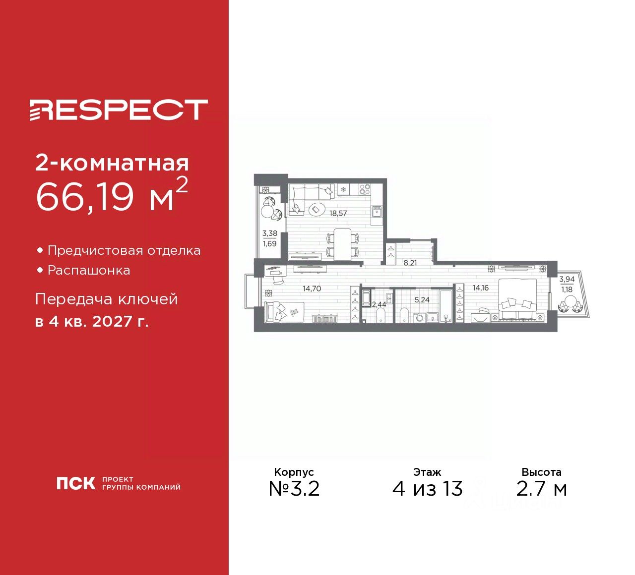 Продается 2-комн. квартира с предчистовой отделкой в ЖК ''RESPECT'' на 4 этаже. Общая площадь: 66.19 кв.м., жилая: 28.86 кв.м., площадь просторной кухни-столовой: 18.57 кв.м. Квартира - распашонка, без проходных комнат, окна выходят на paзные стороны дома. В квартире один балкон и одна лоджия, один совмещенный и один раздельный санузел. Высота потолков 2.7 м.