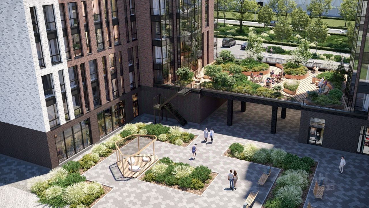 Вся территория квартала будет связана единой концепцией благоустройства, разработанной ландшафтным бюро L.BURO. На эксплуатируемой кровле на уровне первого этажа