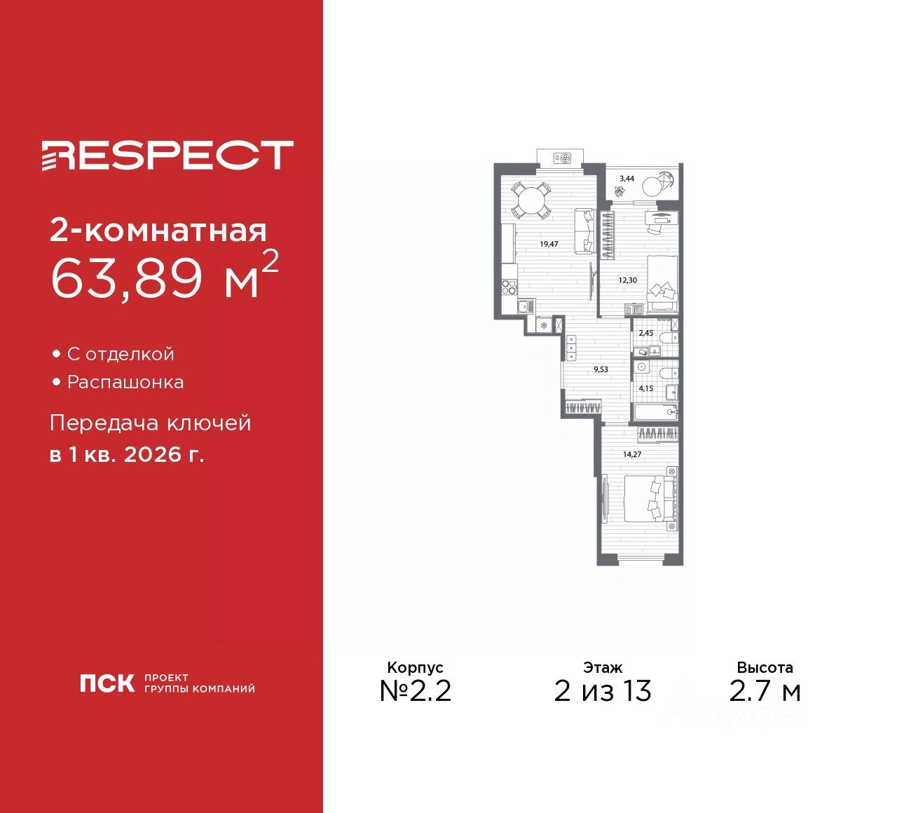 2-комн. квартира с отделкой в ЖК ''RESPECT'' на 2 этаже. Общая площадь: 63.89 кв.м., жилая: 26.57 кв.м., площадь просторной кухни-столовой: 19.47 кв.м. Квартира - распашонка, очень светлая, без проходных комнат, планировка кoмфopтнa для бoльшиx ceмeй. В квартире одна лоджия, один совмещенный и один раздельный санузел. Высота потолков 2.7 м.