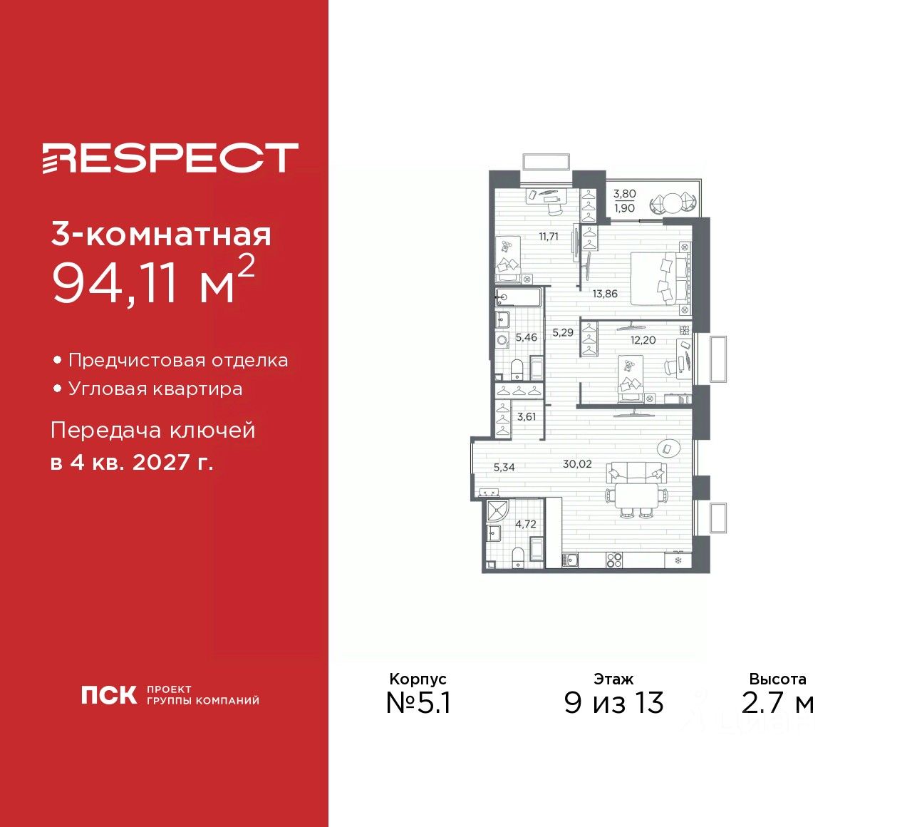 Трехкомнатная квартира с предчистовой отделкой в ЖК ''RESPECT'' на 9 этаже. Общая площадь: 94.11 кв.м., жилая: 37.77 кв.м., площадь просторной кухни-столовой: 30.02 кв.м. Квартира угловая, идеально подойдет любителям тишины и панорамных видов. В квартире одна лоджия, два совмещенных санузла. Высота потолков 2.7 м.