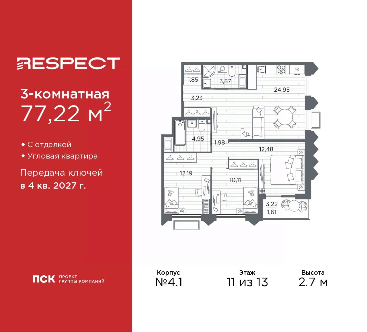 3-комн. квартира с отделкой в ЖК ''RESPECT'' на 11 этаже. Общая площадь: 77.22 кв.м., жилая: 34.78 кв.м., площадь просторной кухни-столовой: 24.95 кв.м. Угловая квартира, очень светлая, естественная вентиляция при открытии окон. В квартире одна лоджия, два совмещенных санузла. Высота потолков 2.7 м.
