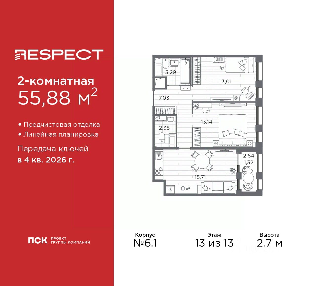 2-комн. квартира с предчистовой отделкой в ЖК ''RESPECT'' на 13 этаже. Общая площадь: 55.88 кв.м., жилая: 26.15 кв.м., площадь просторной кухни-столовой: 15.71 кв.м. Комнаты изолированные, все окна выходят на одну сторону. В квартире одна лоджия, один совмещенный и один раздельный санузел. Высота потолков 2.7 м.