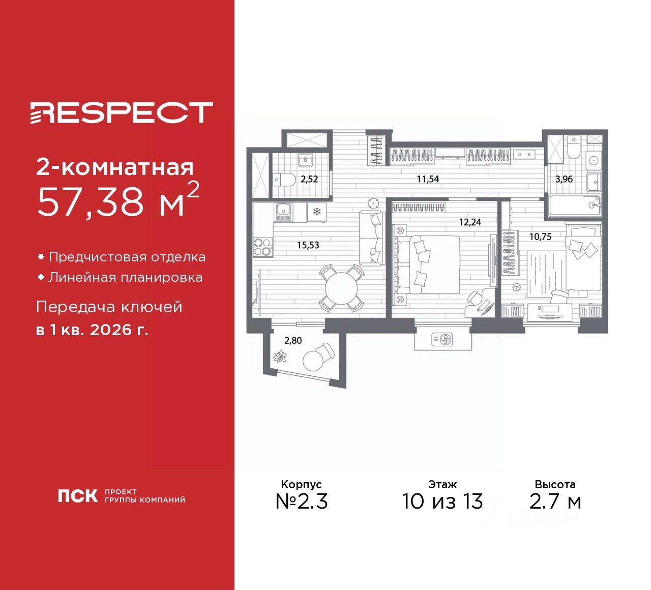 Продается 2-комн. квартира с предчистовой отделкой в ЖК ''RESPECT'' на 10 этаже. Общая площадь: 57.38 кв.м., жилая: 22.99 кв.м., площадь просторной кухни-столовой: 15.53 кв.м. Комнаты изолированные, все окна выходят на одну сторону. В квартире один балкон, один совмещенный и один раздельный санузел. Высота потолков 2.7 м.