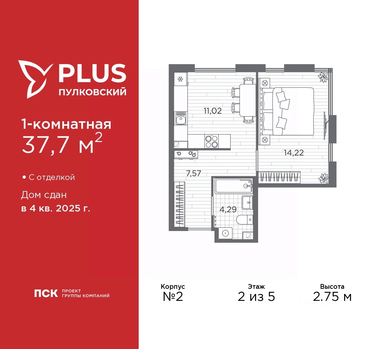 Однокомнатная квартира от застройщика с отделкой в ЖК ''PLUS Пулковский'' на 2 этаже. Общая площадь: 37.7 кв.м. Высота потолков 2.75 м.