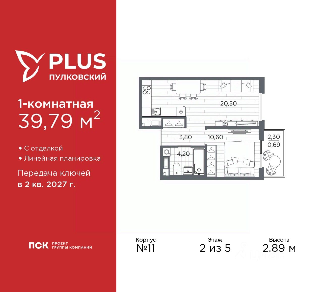 Продается 1-комн. квартира с отделкой в ЖК ''PLUS Пулковский'' на 2 этаже. Общая площадь: 39.79 кв.м., жилая: 10.6 кв.м., площадь просторной кухни-столовой: 20.5 кв.м. Все окна выходят на одну сторону. В квартире один балкон, один совмещенный санузел. Высота потолков 2.89 м.