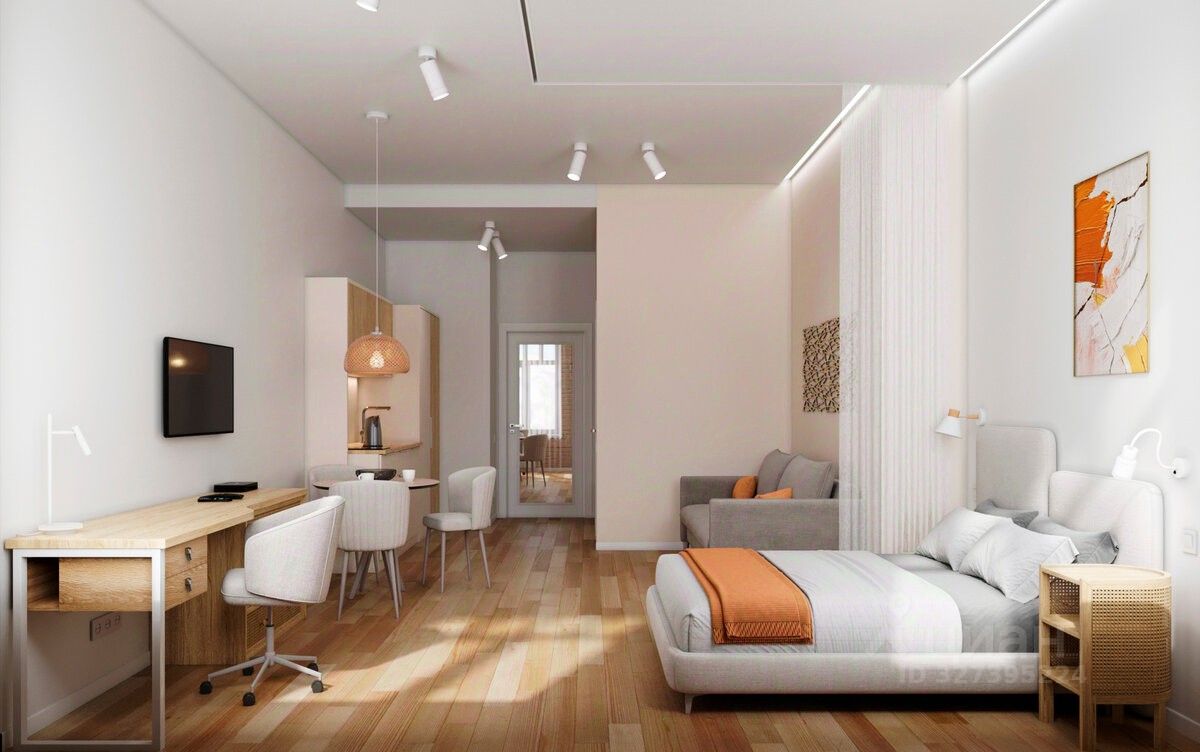 Удобная, классическая, функциональная европланировка. Общая площадь апартаментов - 23.6 м², высота потолка 3 м.