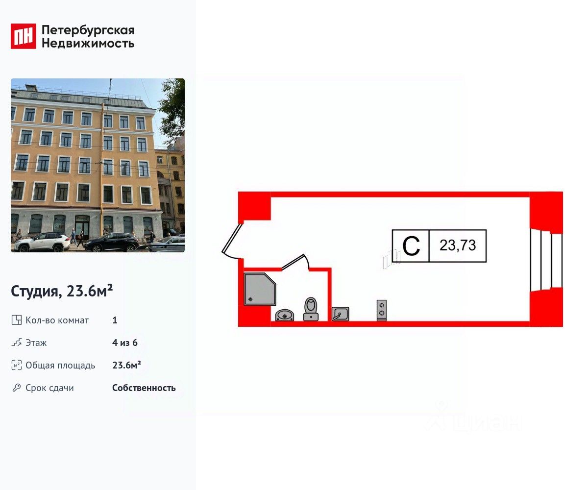 Удобная, классическая, функциональная европланировка. Общая площадь апартаментов - 23.6 м², высота потолка 3 м.