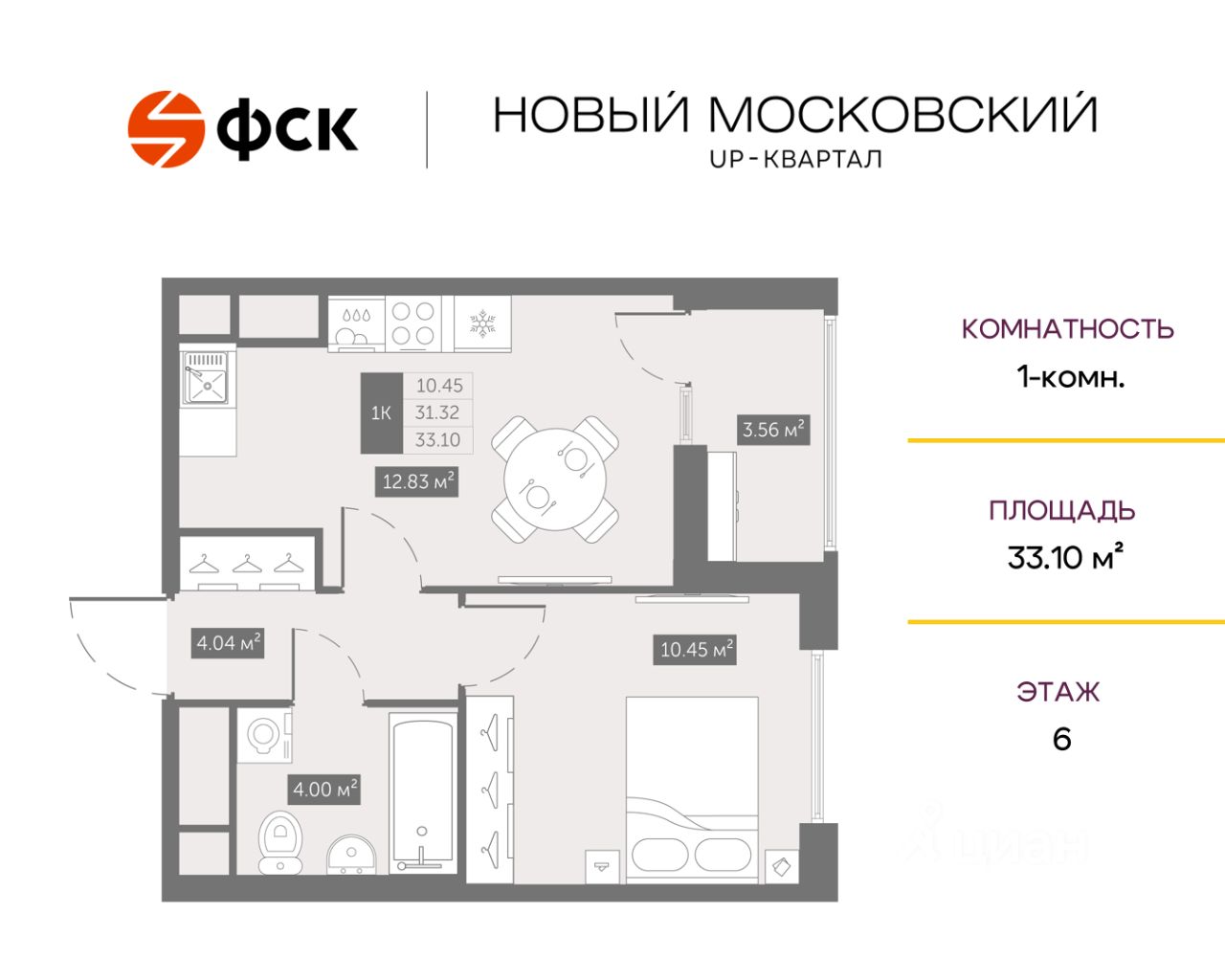 Прямая продажа от застройщика. Беспроцентная рассрочка. 1-к квартира в ЖК квартал ''Новый Московский'' на 6-м этаже. Общая площадь 34. Без отделки.