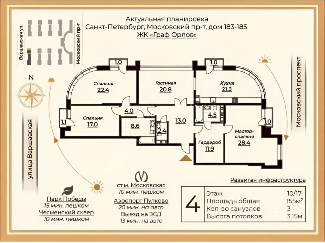 ЖК ГРАФ ОРЛОВ Московский проспект, 183-185, корпус 1 . Новый кирпично - монолитный дом бизнес класса , ВЫСОТА ПОТОЛКОВ 3,15, ВСЯ ЦЕНА В ДОГОВОРЕ, несущие конструкции сведены к минимуму, что расширяет возможности перепланировки. Светлая, видовая трехсторонняя квартира. 4 французских балкона, панорамные окна, 3 санузла, большая гардеробная и прихожая. Бесшумные скоростные зеркальные финские лифты из паркинга на этаж . Подземный паркинг. Отделка под чистовая . На уровне второго этажа есть выход на стилобат /закрытый двор /, на котором находятся зона отдыха и детская площадка. Отдельный вход в подъезд с первого и второго этажей. До метро ''Московская '' и Пулковского парка 5 минут пешком , до парка Победы - 10 минут, до парка Авиаторов - 10 минут. Престижный район, развитая инфраструктура, закрытая охраняемая домовая территория с контролем доступа. В шаговой доступности 7 школ, 2 лицея, 8 детских садов , 23 медицинских учреждения. Количество собственников: 1 Год постройки: 2016 Высота потолков: 3,15 Отопление: центральное Балкон: балкон Наличие парковки: подземная. Квартира в собственности, без обременений продаётся собственником по фактической стоимости. Документы готовы к сделке. Ключи сразу после покупки.