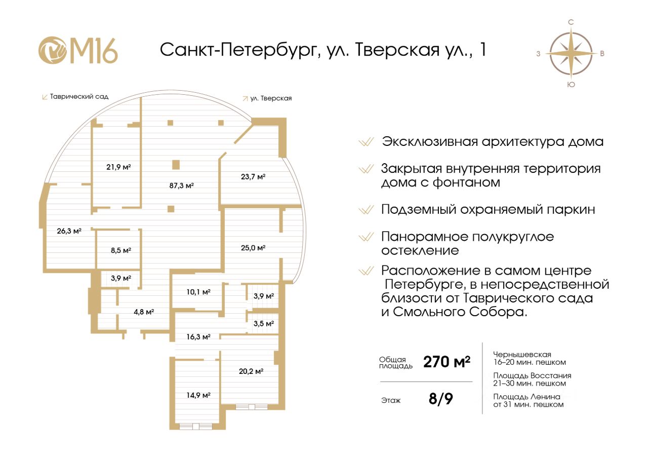 эксклюзивная архитектура дома расположение в самом центре Петербурге, в непосредственной близости от Таврического сада и Смольного Собора. дом класса ''элит'', всего 72 квартиры в доме бесшумные лифты КОNЕ профессиональная охрана, видеонаблюдение, круглосуточный контроль доступа закрытая внутренняя территория дома с фонтаном подземный охраняемый паркинг центральная система приточно-вытяжной вентиляции и кондиционирования в квартире Дом находится в историческом центре Санкт-Петербурга, где можно пешком прогуляться до музеев и театров, посетить рестораны и кафе, фешенебельные магазины, объекты социального назначения. Для образования Ваших детей рядом расположены престижные гимназии и детские сады.