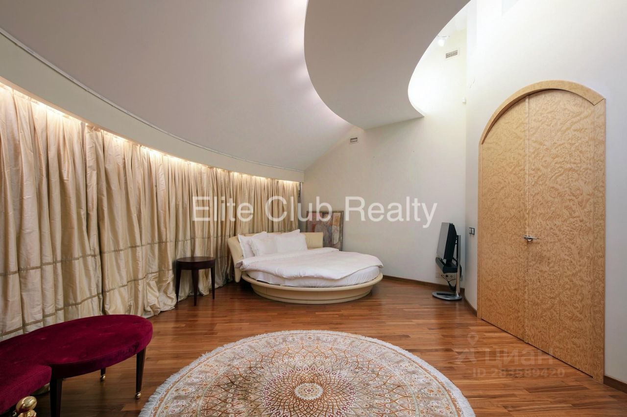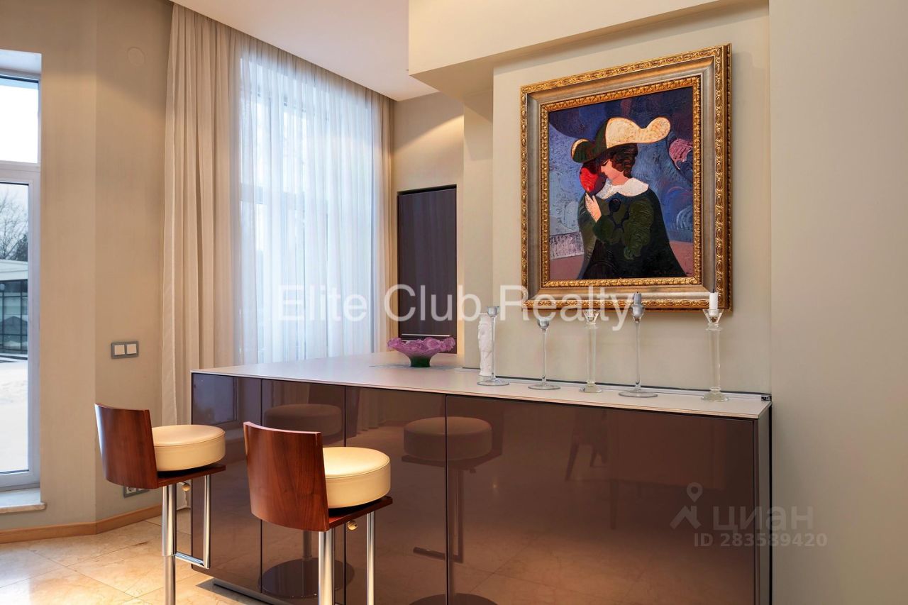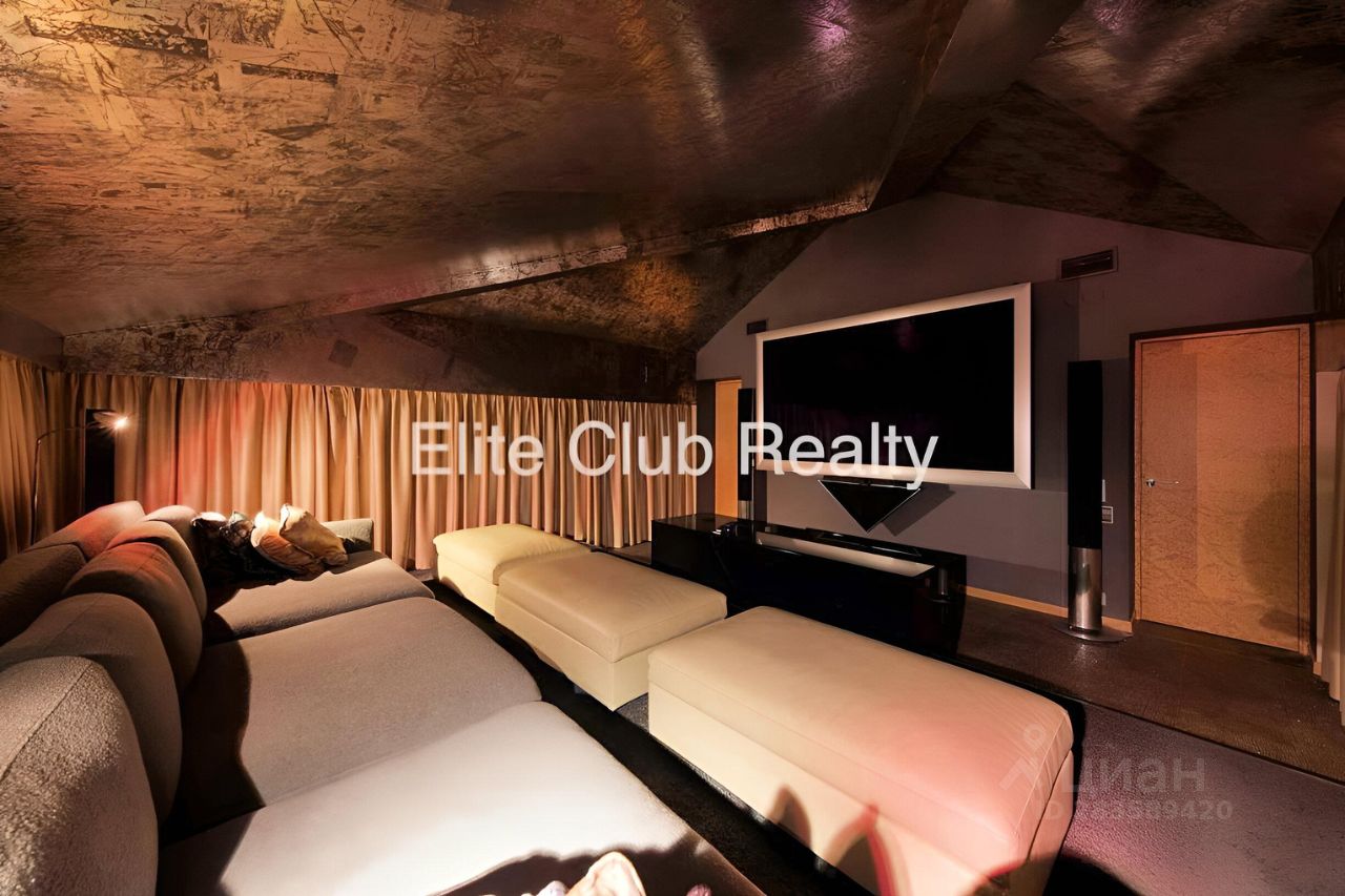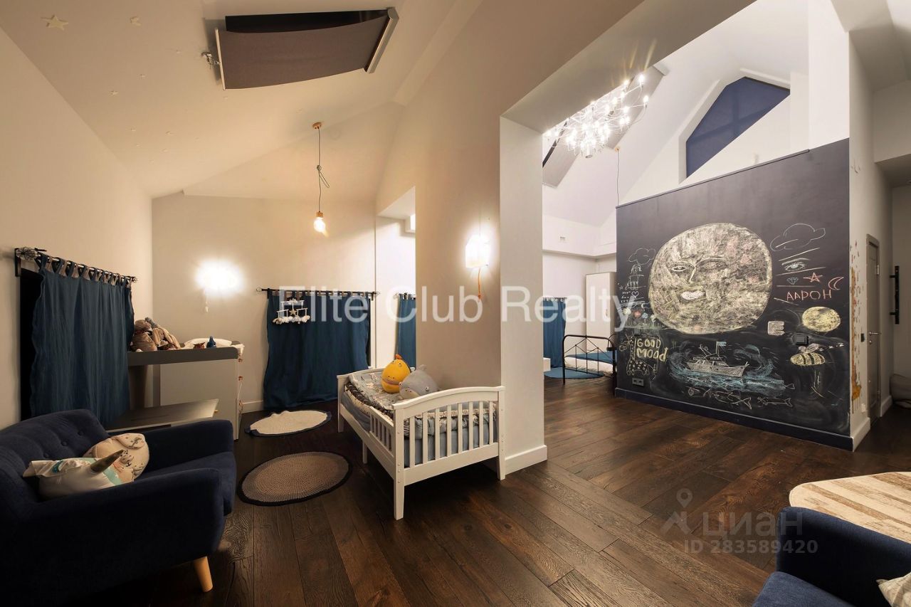 Основной дом имеет 2 этажа и цоколь, площадь дома 440 м2. Первый этаж представлен уютной гостиной. Рядом с гостиной расположена зона столовой и кухни в современном стиле. Также на первом этаже кабинет со вторым светом и камином. На втором этаже запроектированы мастер-спальня с ванной комнатой и гардеробной, большая детская комната со стеной для творчества детей. На цокольном этаже в темных тонах оборудован кинозал, а также имеется комната для хранения и спа-зона с купелью. Год постройки дома - 2006, выполнен из кирпича.