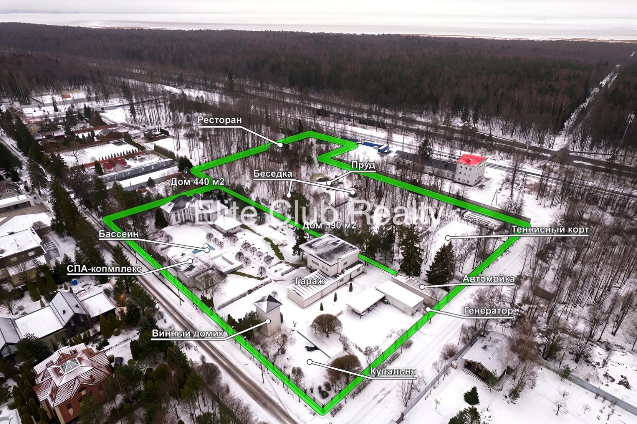 Комплекс включает: - Основной дом - Гостевой дом - Ресторан - Теннисный корт - Бассейн - Спа-комплекс - Двухэтажный винный домик - Гараж на 4 машины - Пруд с осетрами - 2 беседки - Автомойка и парковка на 10 машин - Детская площадка