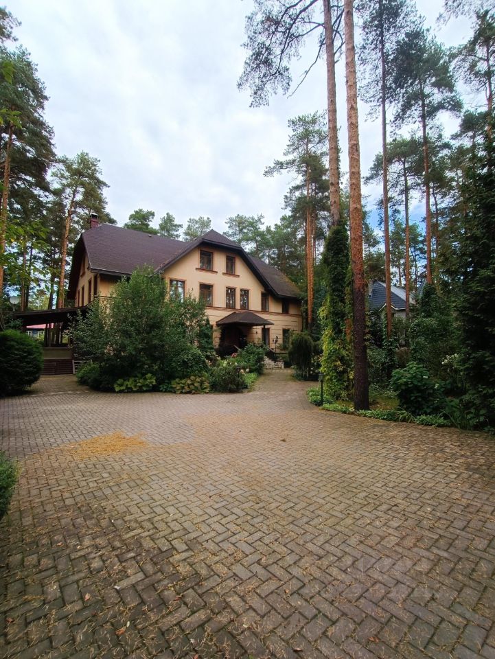 Фундаментальный дом индивидуальной постройки из кирпича, окружённый соснами и городской инфраструктурой.