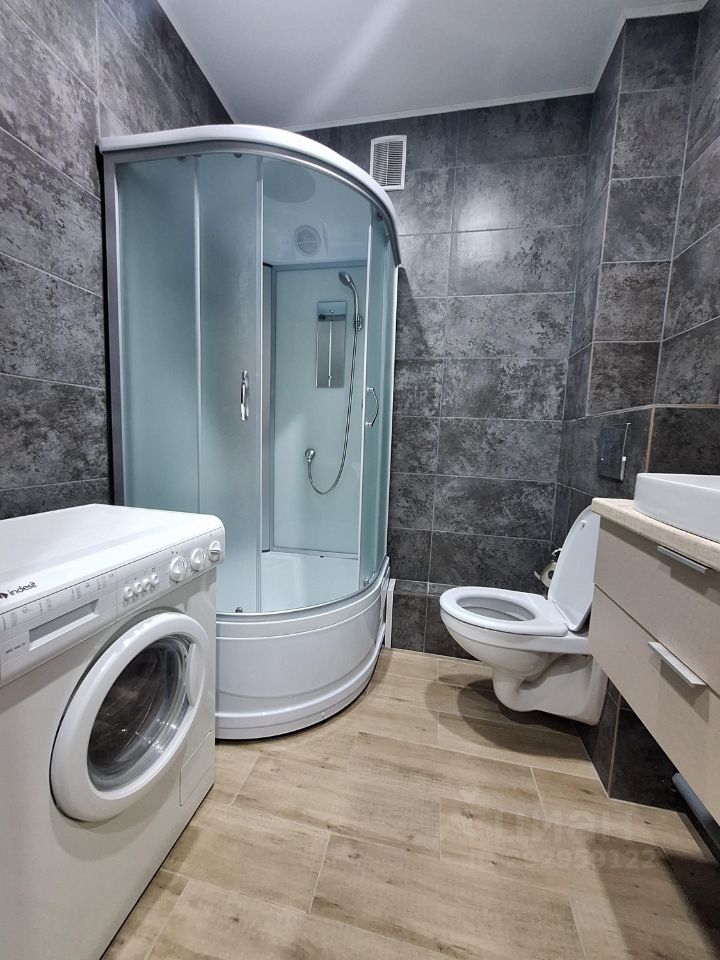 В совмещённом санузле после ремонта душевая кабина, стиральная машина, белоснежная сантехника, установлены счётчики на воду.