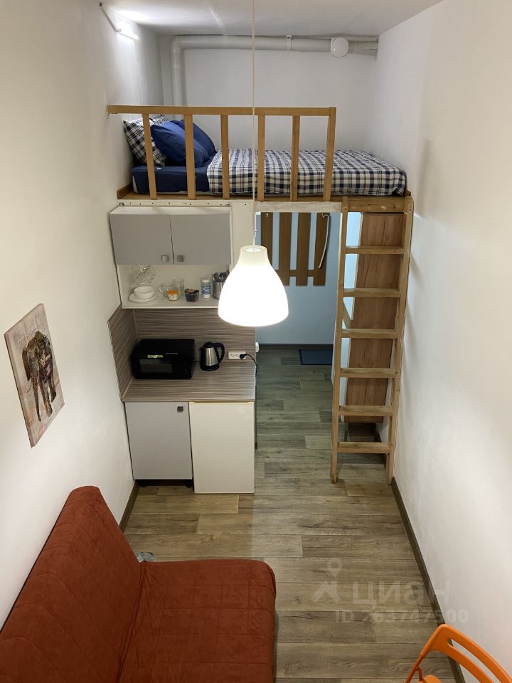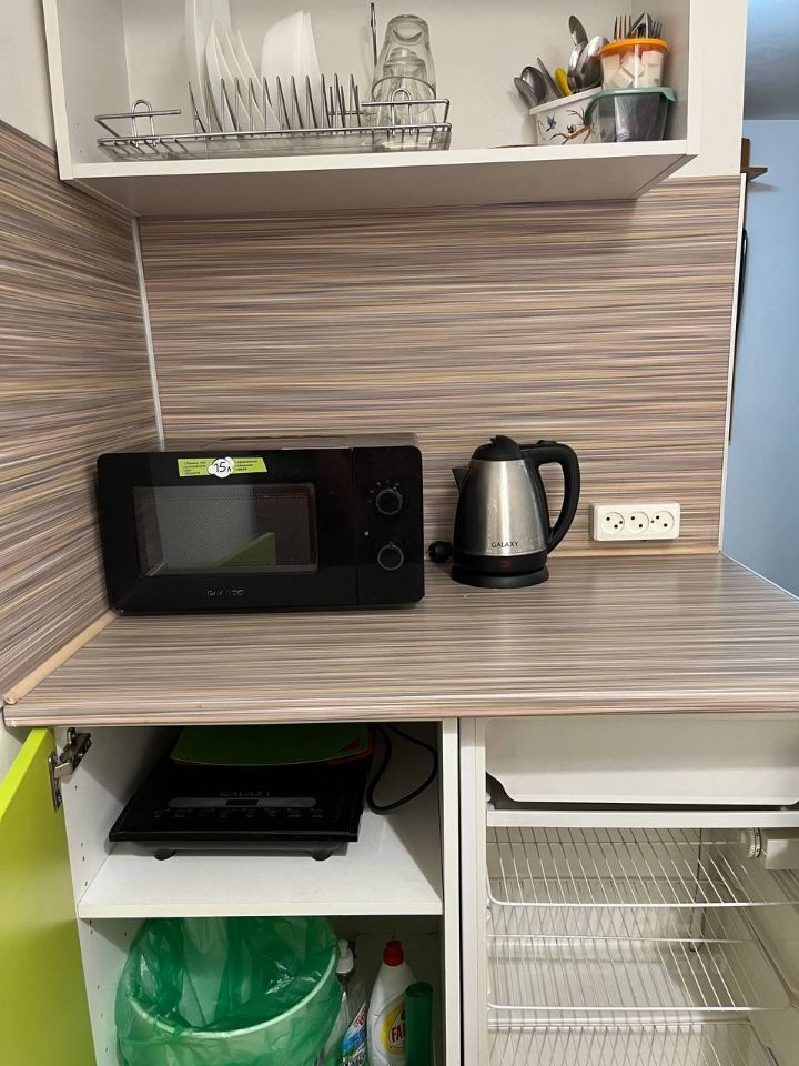Есть все необходимое: На втором уровне большой ортопедический матрас 1.60*2.00, внизу диван-кровать Икея Бединге, стол, шкаф, кухонный блок: холодильник, СВЧ, индукционная плитка, чайник, посуда.