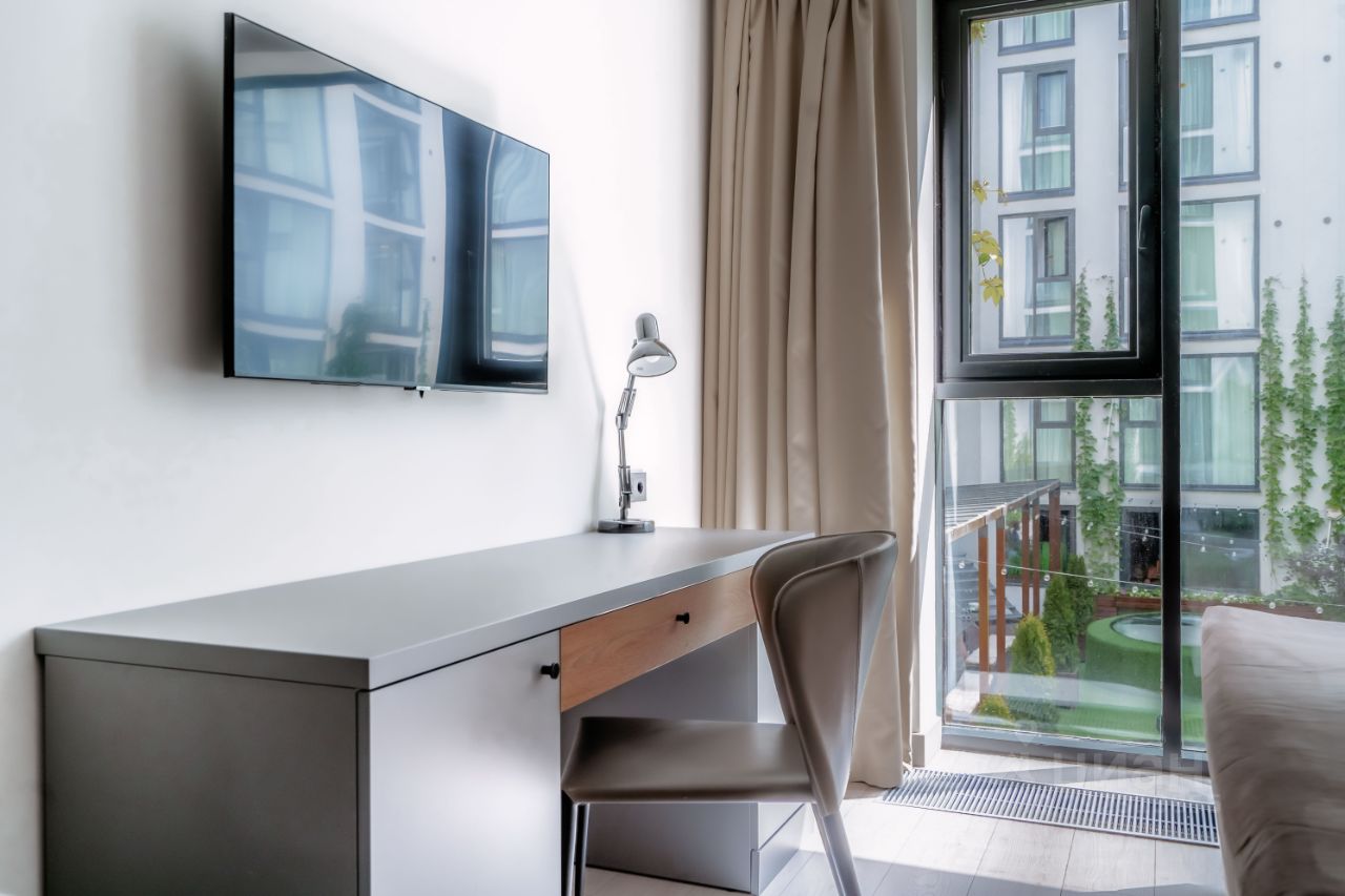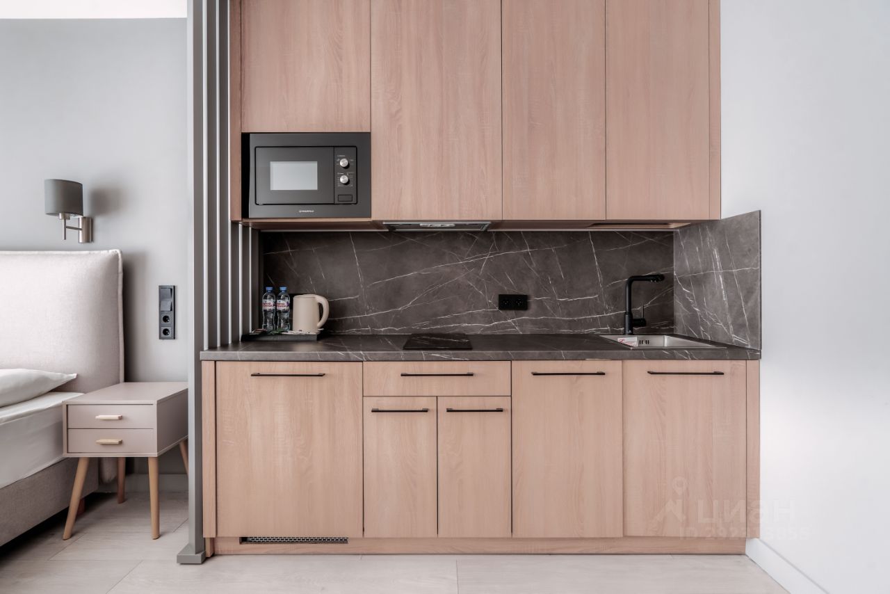 B aпaртамeнтax ecть вce необходимое для длительного проживания - большая двуспальная кровать, кухня, оснащенная варочной панелью, микроволновой печью, посудомоечной машиной мини-холодильником, чайником, посудой для приготовления пищи и сервировки. Имеется стиральная машина, утюг, гладильные принадлежности, фен. Большой телевизор с интерактивным ТВ. Предоставляются халаты и тапочки.