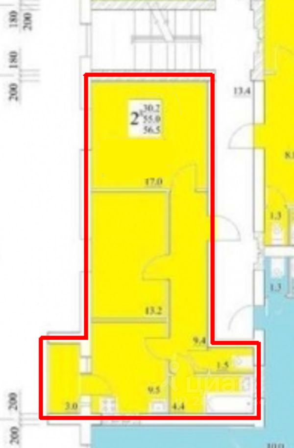 Общая площадь 54,7 кв.м. Функциональная кухня 10 м2 и две просторных комнаты 17+13,2 м2. Раздельный санузел с ванной комнатой. Из кухни выход на лоджию.