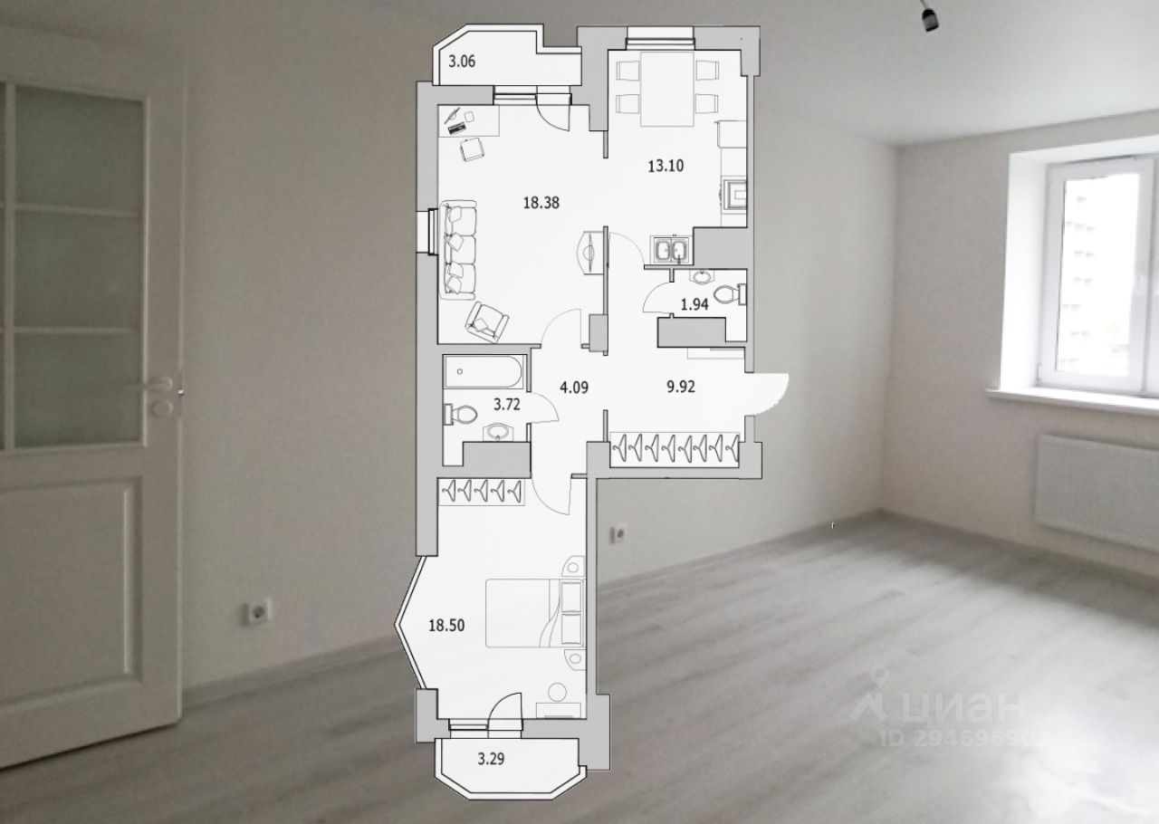 Кухня-столовая 13.1 кв.м. Гостиная 18.4 кв.м с выходом на остекленный балкон 3 кв.м. Спальная комната 18.5 кв.м. с окном-эркером и выходом на остекленный балкон 3.3 кв.м. Вместительная прихожая 14 кв.м. с местом под большой гардероб. Два санузла.