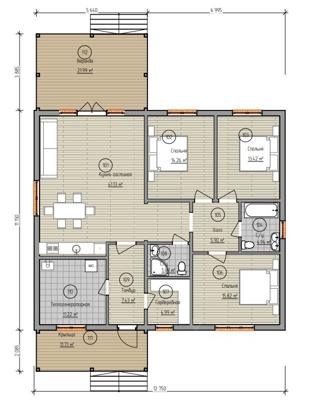 Высота потолков в доме - 3 м. - кухня-гостиная 41,1 кв.м., - жилые комнаты 15,8 + 14,3 + 13,4 кв.м. - котельная 11,2 кв.м., - ванная и сан.узел - 4,9 и 3,5 кв.м., - гардеробная - 5,0 кв.м., - тамбур - 7,4 кв.м., - терраса - 22 кв.м., - крыльцо - 11,7 кв.м.