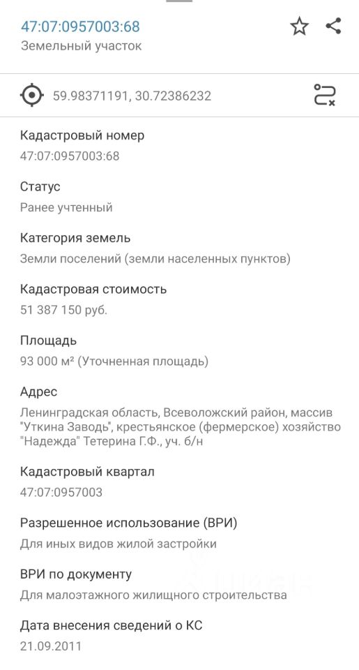 Продам срочно ! Документы готовы к сделке ! Земельный участок 9.3 ГА (Всеволожск) Для малоэтажного жилищного строительства, Земельный участок отнесен к территориальной зоне ТЖ 2 к подзоне ТЖ2-2.Подзона малоэтажной жилой застройки индивидуальными (одноквартирными) и многоквартирными жилыми домами., Адрес: Ленинградская область, Всеволожский район, массив Уткина Заводь