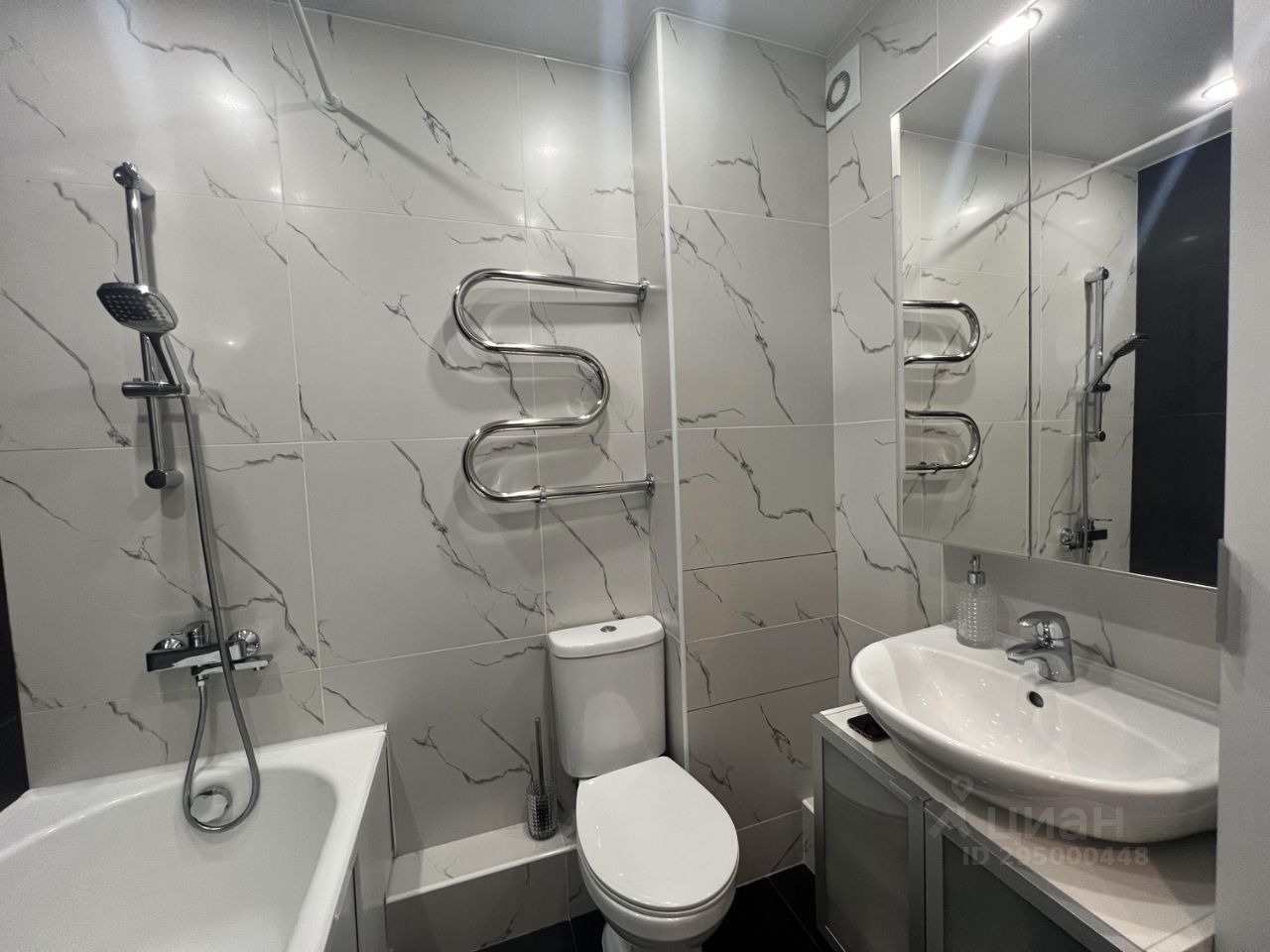 Санузел совмещен, установлена чугунная ванна , теплый пол, комбинированное освещение.