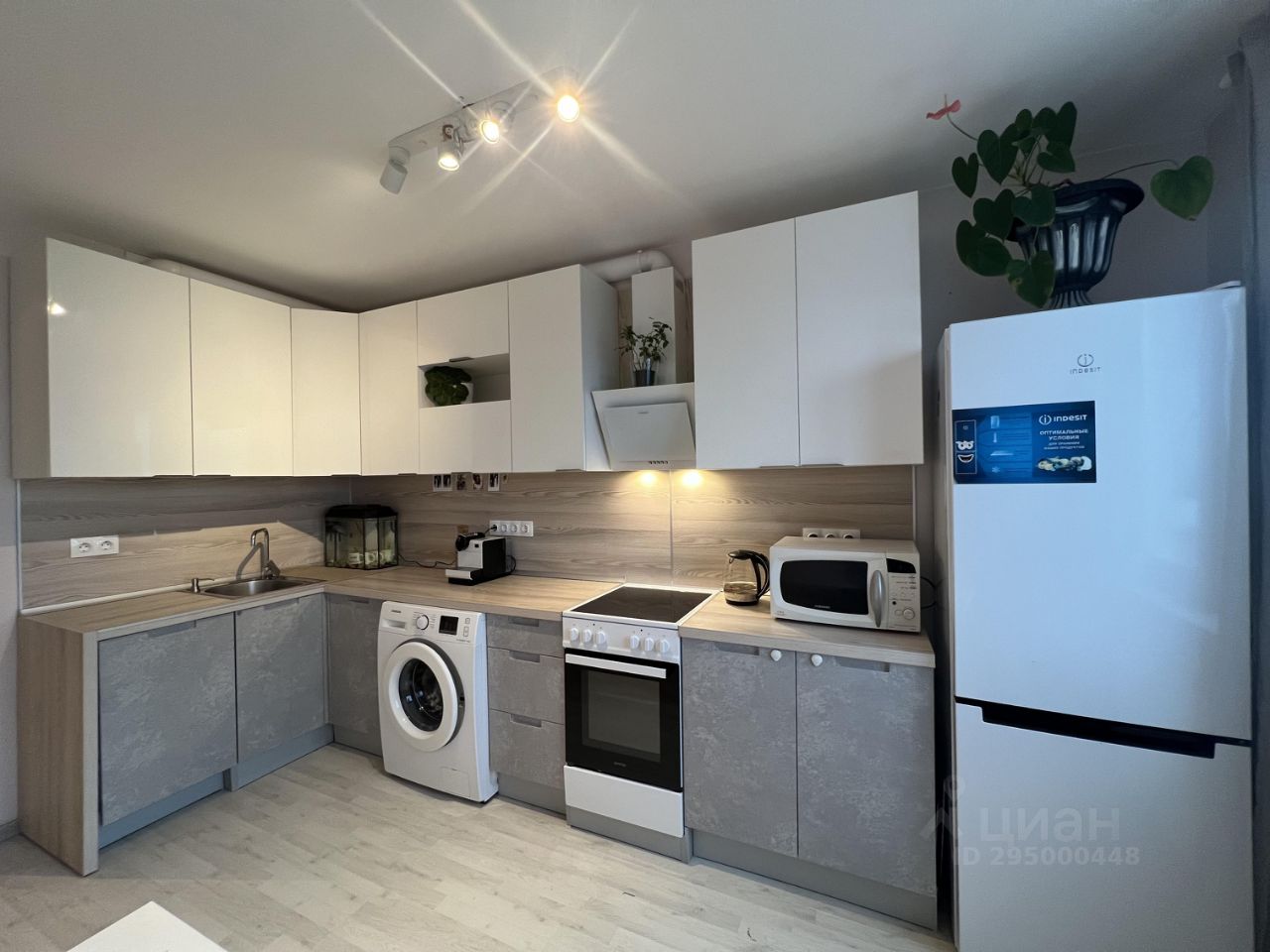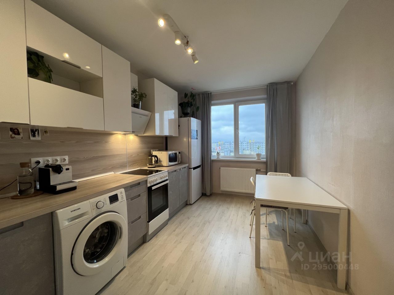 На кухне 11.4 кв.м.,установлен качественный гарнитур, есть вся необходимая техника -холодильник, стиральная машина, плита с духовым шкафом, посудомоечная машина, вытяжка.