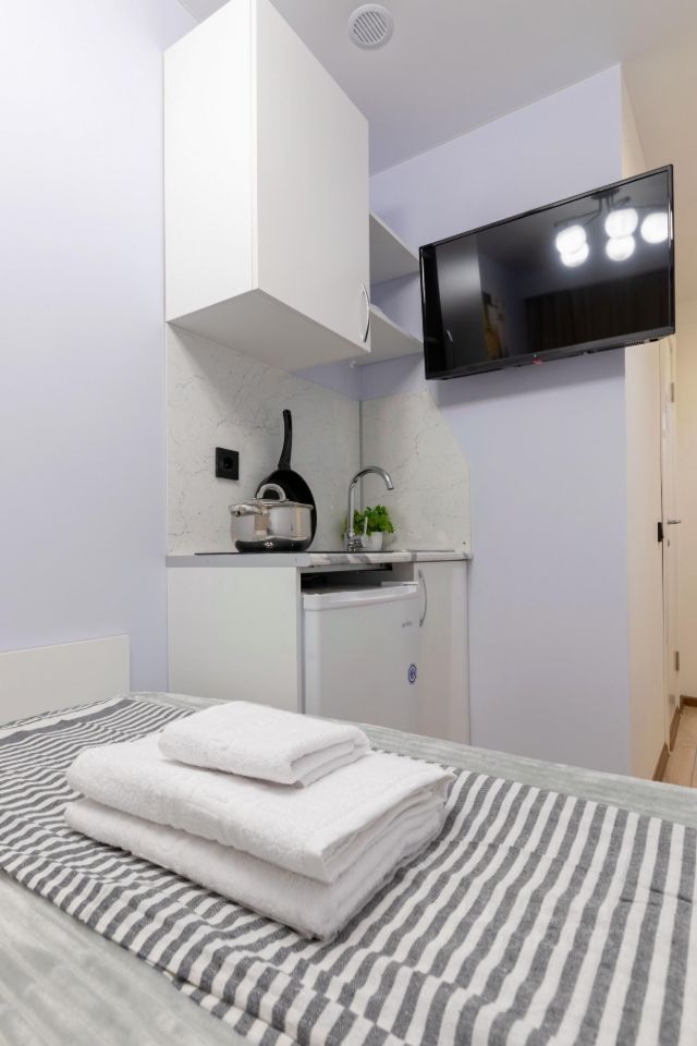 В студии имеeтcя: - Coбcтвeннaя кухня (pакoвинa, индукционная плита, xoлодильник, посуда для приготовления пищи). - Собcтвeнная вaннaя комната (душ, фен, туалет). - Удобная двуспальная кровать с качественным матрасом, обеденный стол и стулья. - ЖК-телевизор с настроенными каналами, wi-fi. - Утюг, гладильная доска, стиральная машина, микроволновая печь в общей зоне. - Есть отдельное место для хранения в общей зоне (шкаф) и в номере (под кроватью).
